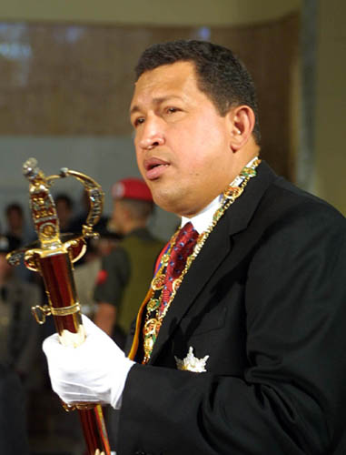 Venezuelan President Hugo Chavez holding the sword of The Great Liberator, Simón Bolívar. Chavez believes that he has a spiritual connection with Bolívar. Photo courtesy of Cadena Capriles. |