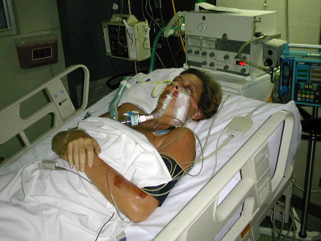 Malvina Pesate in intensive care at Clinica Caracas Hospital recovering from a bullet wound that entered her left cheek and exited out the base of her neck. Malvina was not told she had been shot until three days later. Photo courtesy Malvina Pesáte. |