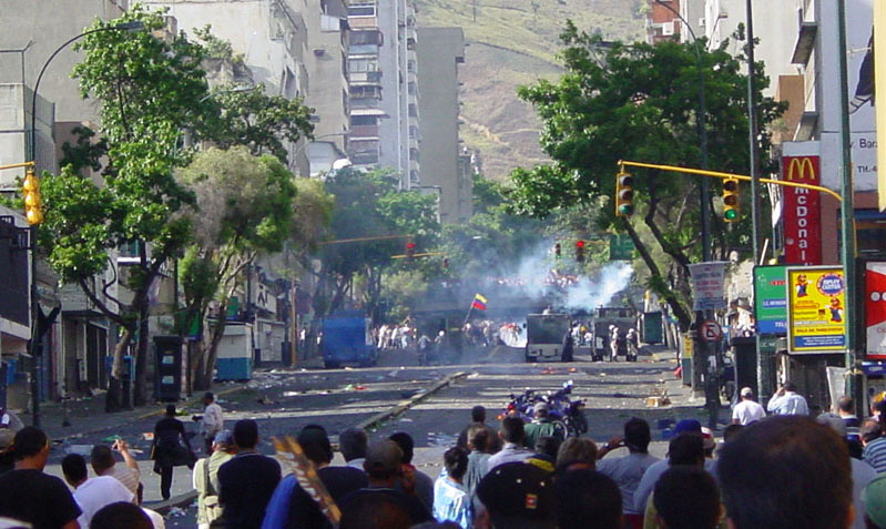 Looking up toward the Llaguno Overpass from Baralt Avenue. The opposition marchers are in the foreground. This photo was taken after the police had created a buffer between the two factions, but before the heavy firing between Chávez supporters and the police that started after 4:30 p.m. Photo by unknown . |