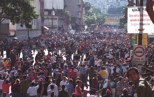 News that the march was going to Miraflores incited thousands of Chavez's loyal supporters to gather around the Presidential Palace (to the left of yellow sign). Photo courtesy of El Universal.