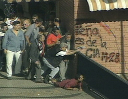 A frame from the famous footage of pro-Chavez gunmen shooting onto Baralt Avenue from the Llaguno Bridge. The footage--which tipped popular sentiment against Chavez--was taken by Venevision reporter Luis Alfonso Fernández. Photo courtesy of Luis Alfonso Fernández. |